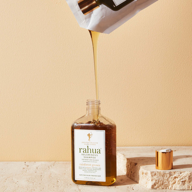 • two bottles of rahua voluminous shampoo and conditioner with gold caps and white labels with green lettering. there's a sticker in the upper right with "beauty inc. the greatest hair care 2025"|variant:93-oz two bottles of plastic with gold caps of rahua voluminous shampoo and voluminous conditioner floating on the surface of a pool on top of concrete stairs with a sticker in the top left of beauty inc the greatest hair care 2025|variant:93-oz