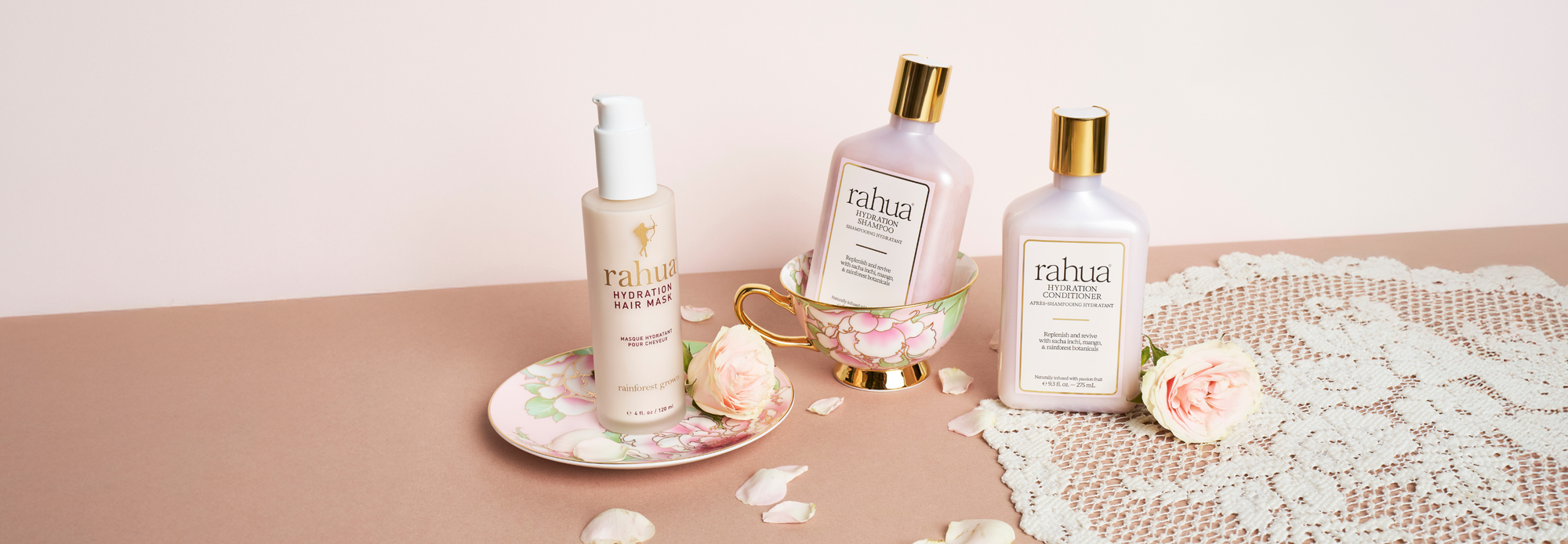 A set of four Rahua hair care products, including a hair mask, detangler, shampoo, and conditioner, each in a tall, slender white bottle with gold-colored caps. The products are labeled with the brand name 'Rahua' and the words 'Hydration Heroes'. A set of four Rahua hair care products, including a hair mask, detangler, shampoo, and conditioner, each in a tall, slender white bottle with gold-colored caps. The products are labeled with the brand name 'Rahua' and the words 'Hydration Heroes'. Background with leaves